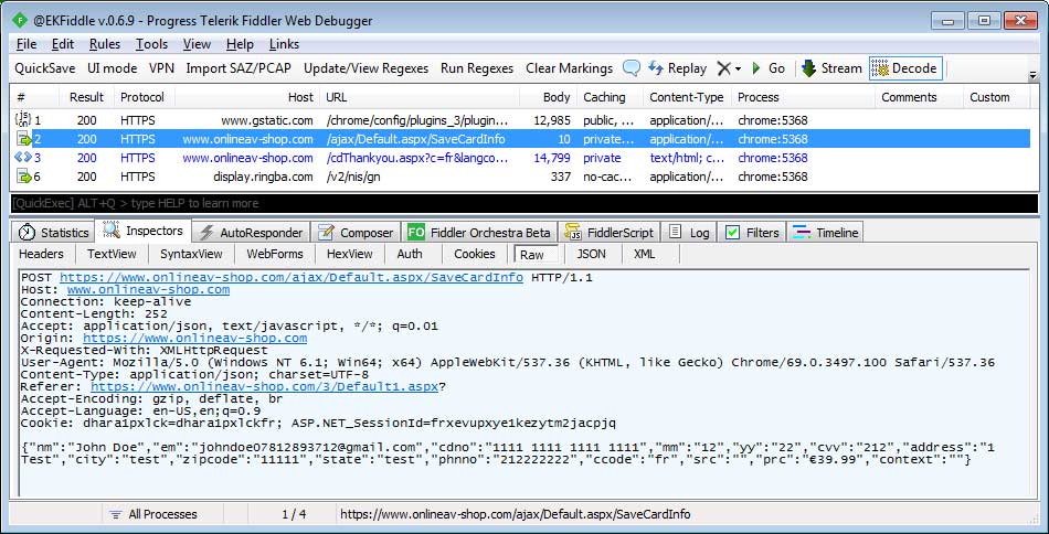 The information collected by this scam consists of the visitor’s name, email, card number, expiration date, CVC (Card Verification Code), address, city, state, zip, and phone number. When you are done entering your info and submit it, the page will connect to https://www.onlineav-shop.com/ajax/Default.aspx/SaveCardInfo where the information is saved.